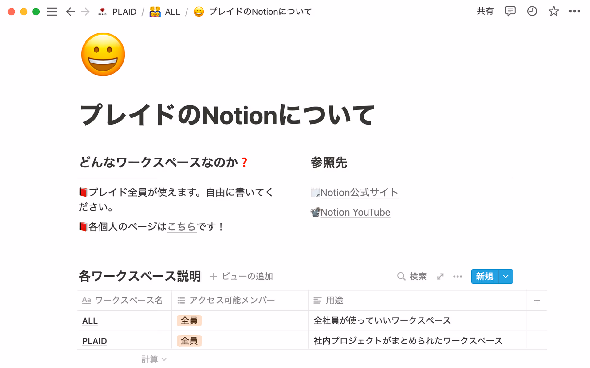 さて、運用をはじめたプレイドが最初に作ったページは何だったのでしょうか。それはワークスペースの用途を簡略的に説明したページです。基本的な運用ルールと参照先がまとめられ、ここからプレイドのNotionはスタートしました。それから各チームのページが次々と誕生。その際、梶原さんはこう伝えました。「各チームのメンバーが使いやすいよう、型にはめずに自由に作成してください」と。